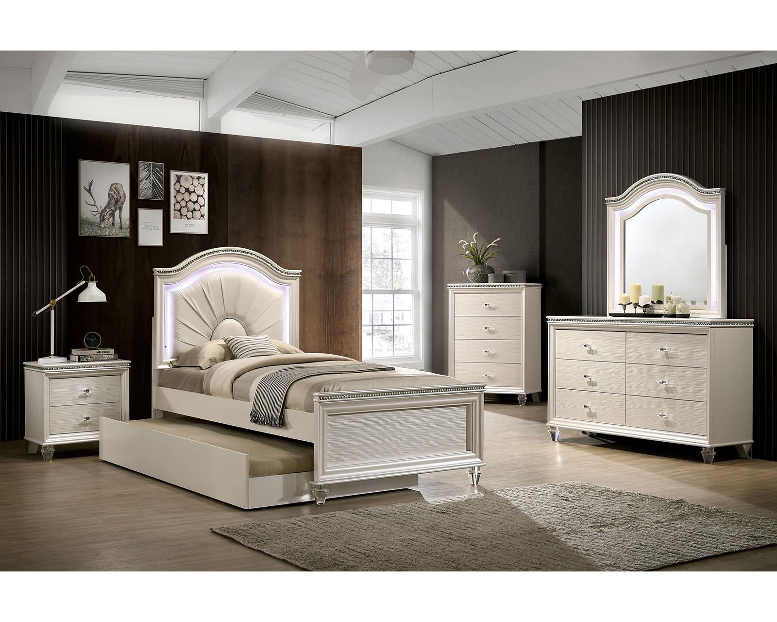 This bedroom set from the Allie Collection is one the kids can grow with. The padded headboard is upholstered in a pleated leatherette, and includes a reading light. The pearl white finish, classic design, and metal accents pair well with any color, ensuring that this set will match whatever phase they encounter. Add even more accommodation space with the available trundle bed!
