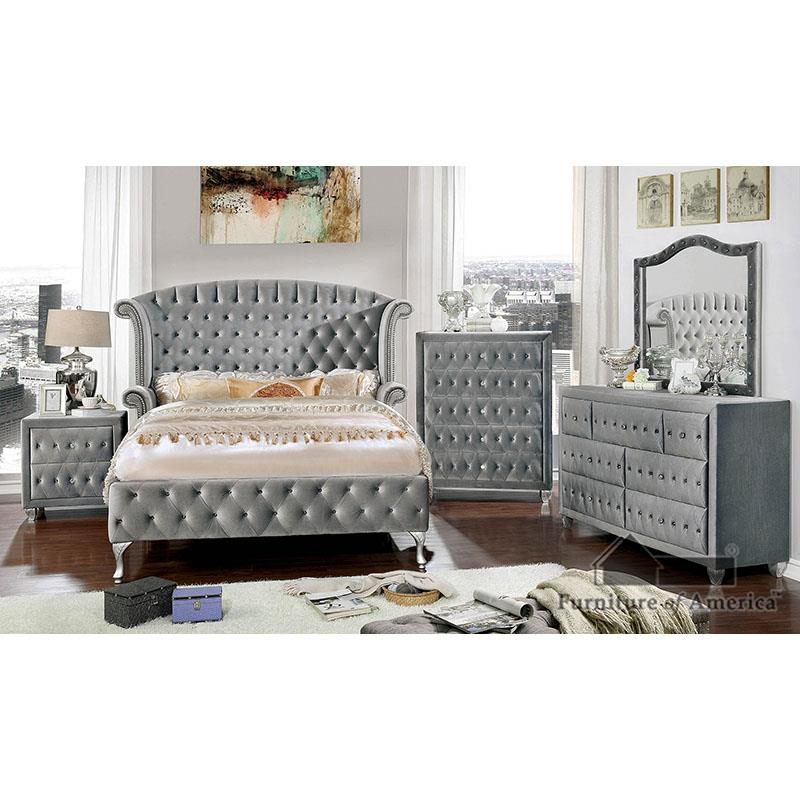 Comforting cushioned velvet-like fabric encompasses this chic bedroom set. Admire the glamorous wingback headboard as glimmering acrylic button tufts and framing nailhead trim dazzles. Run your hands over the soothing night stand and easily store essentials in its storage space. Cabriolet feet add a finishing polish as they provide unwavering support to this elegant bedroom set.