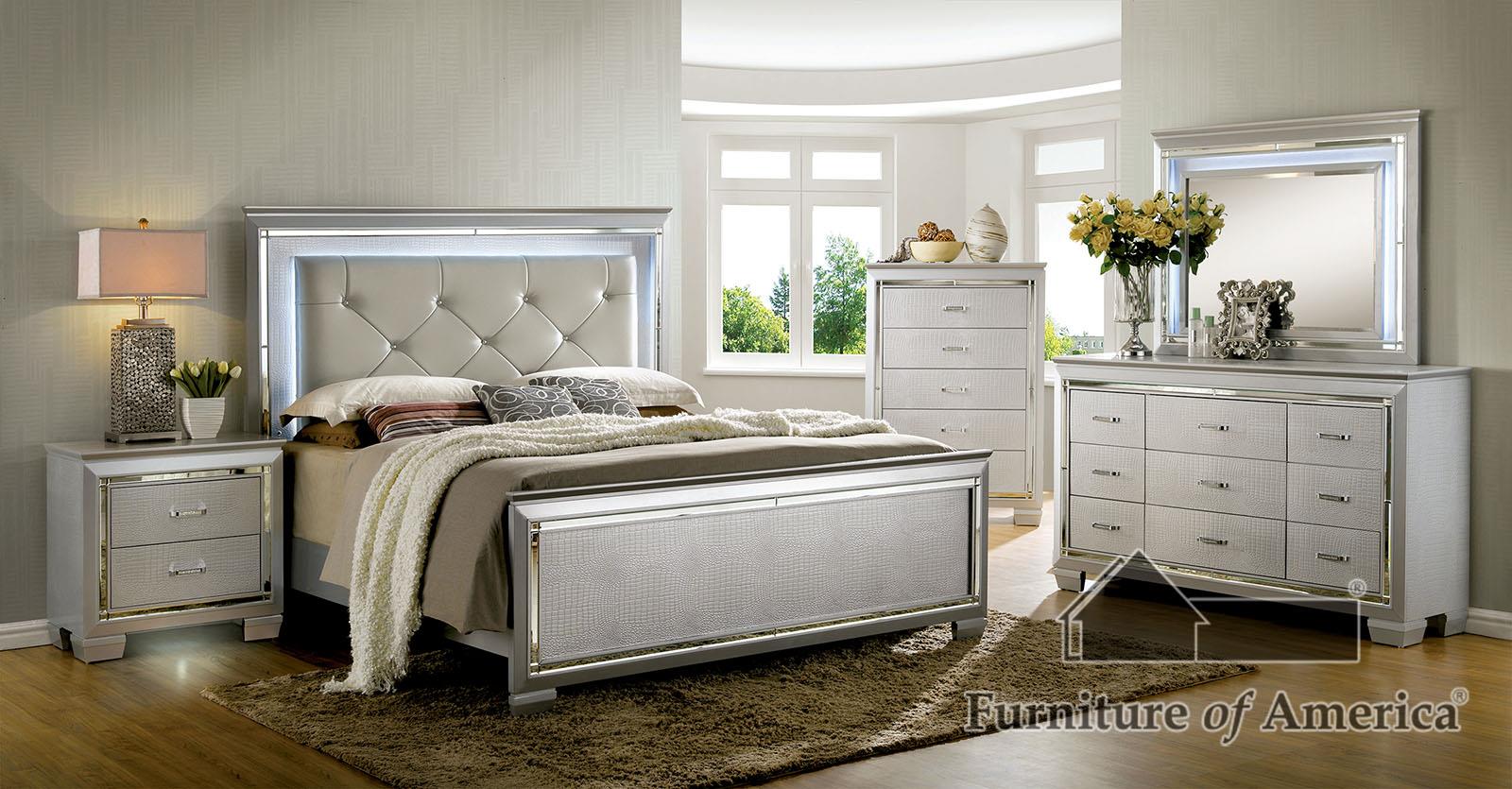 Specifically designed to accentuate a glamorous feel, this bedroom collection brings a combination of class and contemporary style to your bedroom. Crocodile embossed veneer and silver lining panels stand out throughout every piece while the button tufted headboard adds a charming effect. The headboard, mirror, and night stand have built-in LED lights to illuminate the mood.
